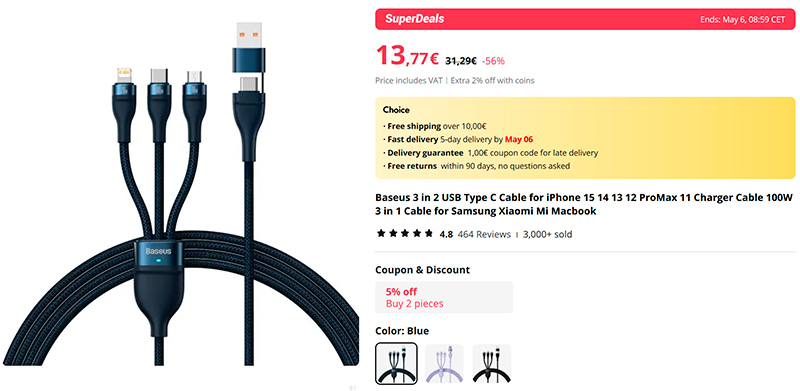 Промокод - CABLERUXX дает скидку в 2 от 6$, поэтому заказывать нужно минимум 2 кабеля.