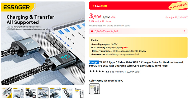 Essager - очень неплохой производитель кабелей, я сам использую пару их кабелей с дисплеем, и вот тут новая модель их кабелей с дисплеем, который показывает мощность зарядки (это очень удобно и наглядно), и поддерживает зарядку до 7А и 100 Вт. На метр и два метра.