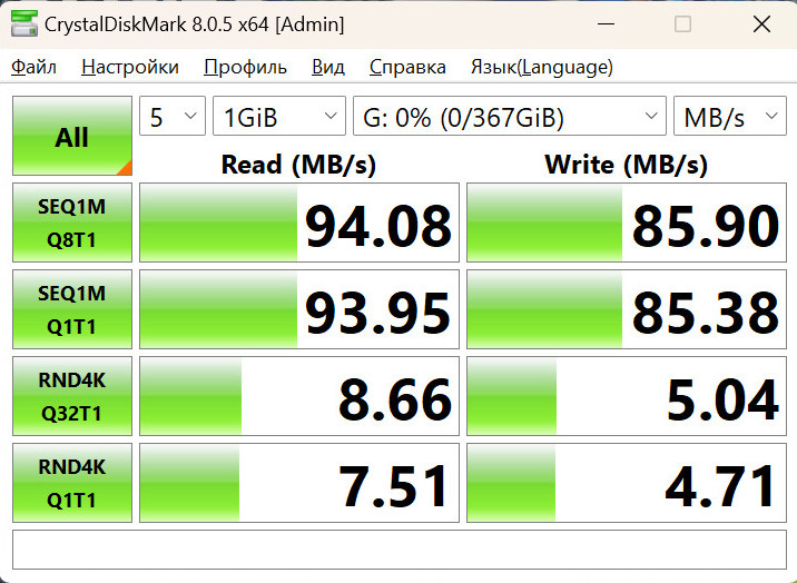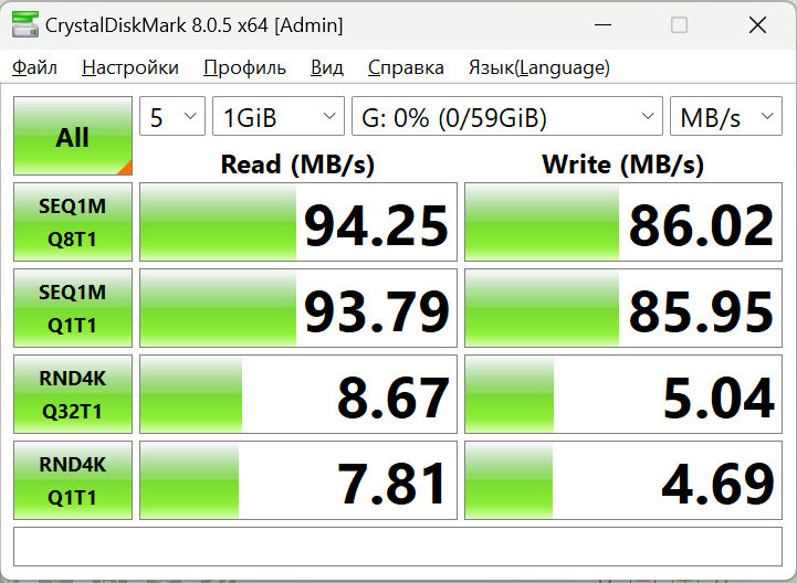 Приехала карта, прогнал тесты. Ну, 160 мегебайт/с не получилось, но 94 мегабайта в сек на чтение и 86 мегабайт в сек на запись - вполне.