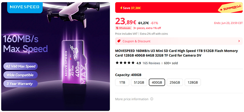 После быстрой флешки Movespeed решил себе еще и microSD от этого производителя прикупить: мне как раз нужна была емкая карта памяти для нового планшета, а у Movespeed мне приглянулась карта на 400 ГБ (туда все влезет) за €24 (та же SanDisk Ultra на 400 ГБ - €38). Там же есть и другие размеры, но именно 400 ГБ - самая выгодная, потому что 512 ГБ - уже в два раза дороже.