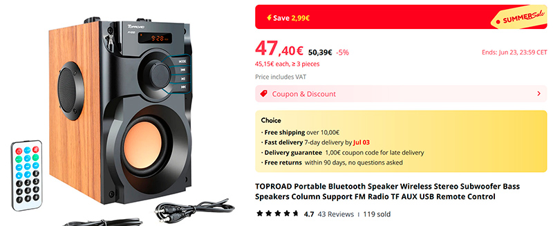 Хотите очень прикольную беспроводную колонку - для дома, для дачи? Колонка Toproad! Деревянный корпус, может воспроизводить аудио с карты microSD (есть пульт управления), также есть FM-радио и ручка для переноски. Два спикера по 2,5 Вт, сабвуфер на 10 Вт. Аккумулятора хватает на 6 часов работы.
