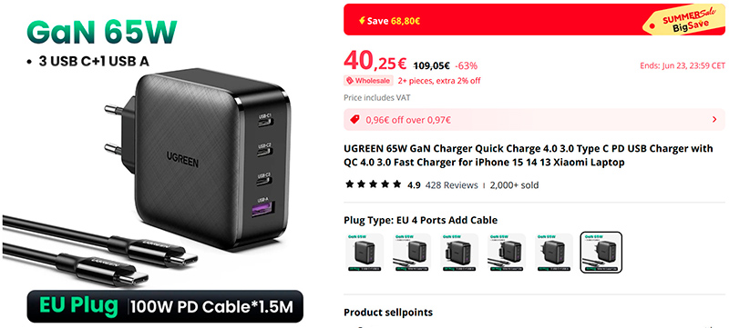 На 65вт только три порта, а на четыре - только 100вт, и в полтора раза дороже.