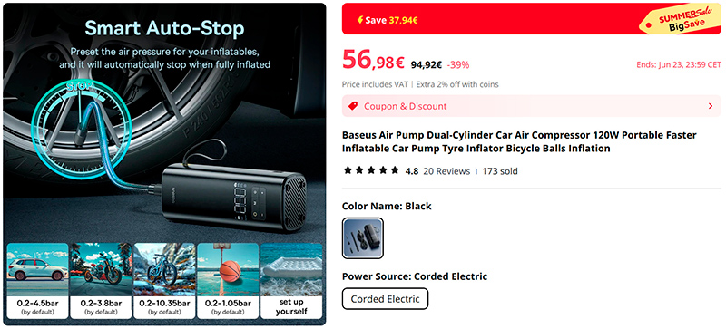 Беспроводной насос Xiaomi, который я использую для накачки велосипедных шин и мячей - это, конечно, хорошо, но для автомобилей он явно не подходит: и качать будет долго, и автомобильную шину с нуля просто не накачает - аккумулятора не хватит. Так что для автомобиля лучше использовать проводной насос (питание-то есть), а среди проводных насосов хороший вариант - вот этот насос Baseus Dual-Cylinder. Компактный, при этом удобный и мощный. Обещают полную накачку с нуля за 4 минуты 30 секунд.