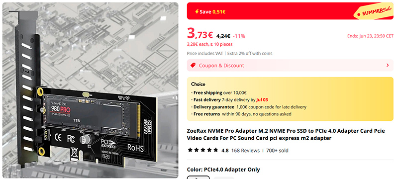 На материнской плате только один слот для SSD M.2 NVME, а хочется поставить еще одну платку для - ну, например, терабайной папки облачного диска? Если на материнке есть слот PCIe 4.0, то никаких проблем - копеечный переходник, куда вы можете поставить диск SSD M.2 NVME любого размера и любой емкости до 2 ТБ.