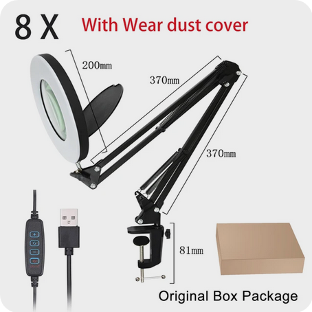 Теперь насчет пучка. Предполагается, что струбцина будет цепляться за задний край стола. Подъема в 40 см. (вертикальная часть крепления) для меня мало, я люблю, чтобы вся поверхность стола была освещена. Поэтому если притянуть лампу поближе, то светильник оказывается между лицом и столом. Так и задумано наверное, потому что то, что делаешь непосредственно руками - красишь ногти, клеишь модели, паяешь схемы - хорошо освещено и удобно смотреть в лупу. Но если писать или работать на компьютере - то освещения маловато. Я для себя взял лампу на длинной вертикальной "ноге".