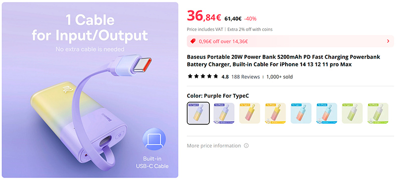 Легкие портативные аккумуляторы - самая востребованная штука. А самые удобные портативные аккумуляторы - те, у которых есть встроенный кабель для зарядки. Вот один из таких вариантов - портативный аккумулятор Baseus с мощностью зарядки 20 Вт, емкостью 5200 мАч, поддержкой Power Delivery и встроенным кабелем. Цвета веселенькие, что и хорошо, есть варианты с Type-C и Lightning.