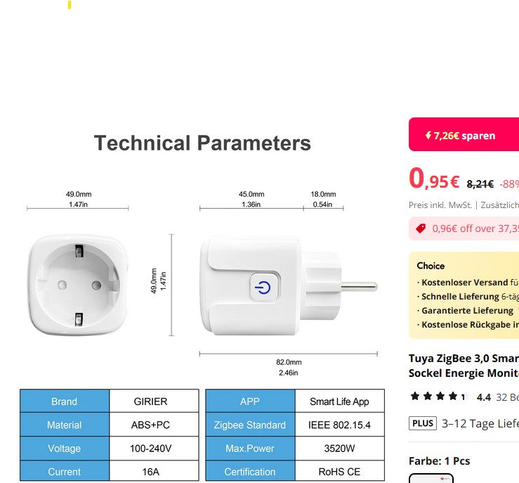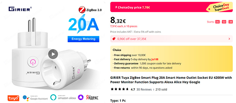 Умная розетка GIRIER Tuya ZigBee Smart Plug 20A с поддержкой протокола ZigBee и всех голосовых ассистентов, включая Google, Alexa, Алиса. Может управляться через свое приложение, поддерживает работу по расписанию, также ведет мониторинг потребления электроэнергии.