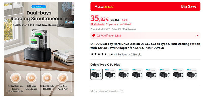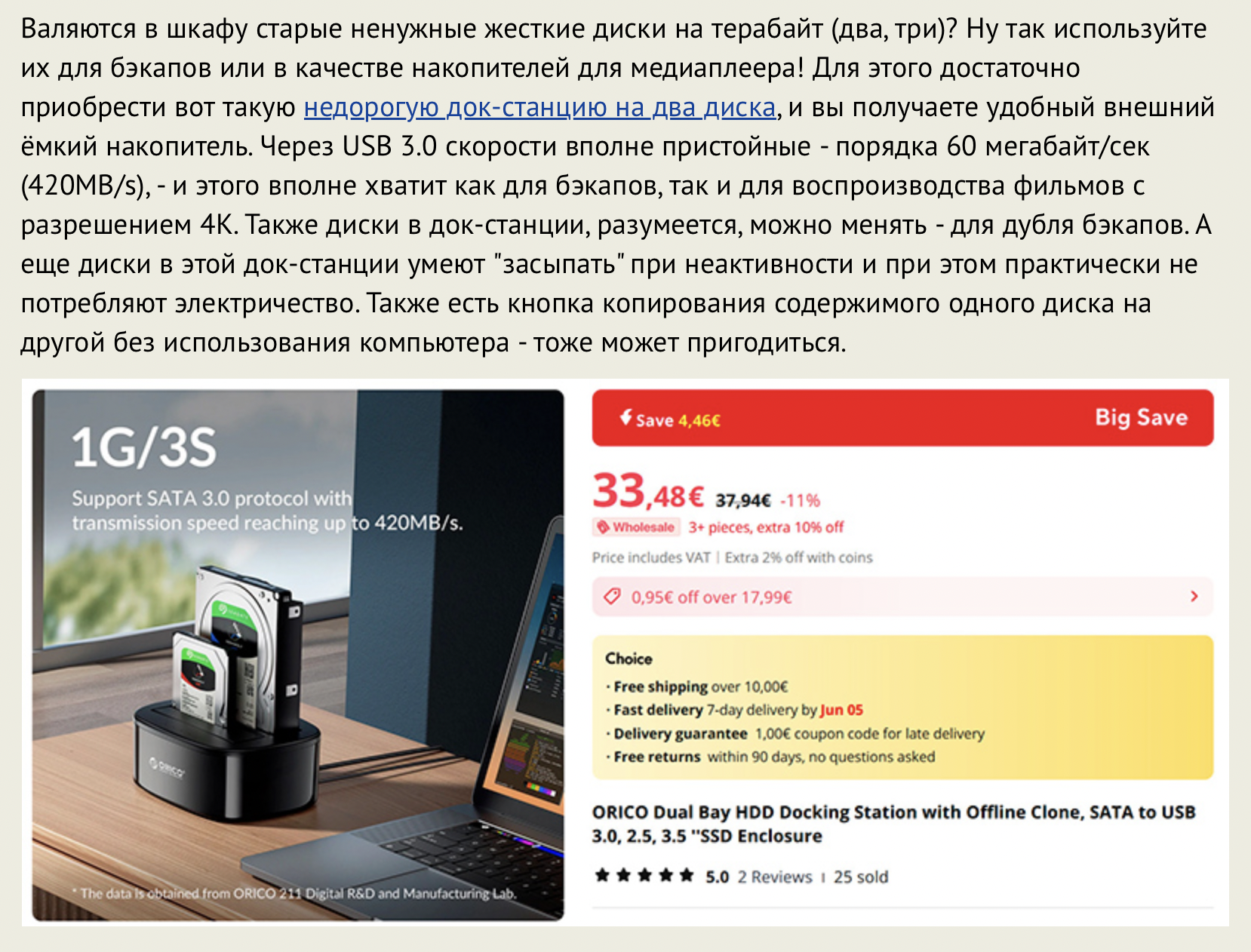Валяются где-то в ящиках старые трехдюймовые HDD, вместо которых вы поставили SSD? Ну так используйте их для бэкапов, всяких медиаданных и так далее. И не нужно тратиться на дорогущий NAS - просто купите вот такую двухдисковую станцию Orico, работающую через USB 3.0, вставьте в нее диски и пользуйтесь. Работает с дисками 2.5/3.5", скорость перекачки - порядка 100 мегабайт в сек, есть кнопка копирования с одного диска на другой без компьютера, поддерживается суммарная емкость до 36 ТБ, устройство умеет уводить диски в спящий режим при неиспользовании. Входящий в комплект кабель может подключаться и к Type-C (ноутбук, смартфон, планшет), и к USB-A у ПК.