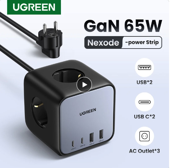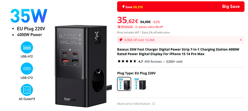 Удобная зарядная станция Baseus "7 в 1": тройник на три розетки, два выхода USB-A, два выхода Type-C, дисплей, на котором показываются параметры зарядки. Суммарная мощность зарядки - 35 Вт.