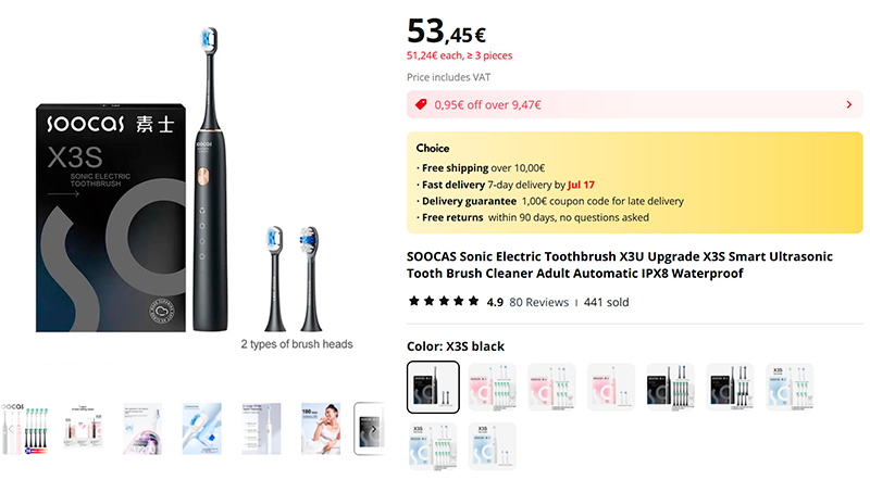 Какую именно щетку заказывать - вопросов не было. У меня их было много разных: от дешевых до дорогущих (Philips присылали две своих топовых щетки, которые стоили чуть ли не €200). Ну и в результате я уже много лет пользуюсь только Soocas X3 - они меня устраивают на все сто, равно как и их чистящие насадки. У первых моделей, которые я покупал, были проблемы с тем, как они подключались к питанию, и этот узел быстро выходил из строя. Потом они его модифицировали - это модели Soocas X3U и совсем новая Soocas X3S, - и после этого они стали вполне долговечные.