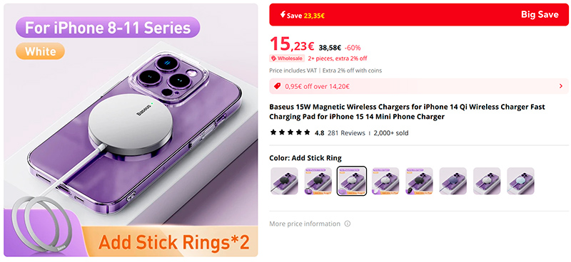 Если такой зарядки нет, и вы хотите магнитную зарядку типа MagSafe - вот недорогой вариант от Baseus. Там, кстати, кольца уже могут входить в комплект