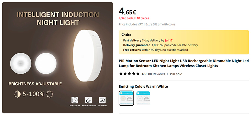 Простенький ночничок с датчиком движения и липучкой. Элементарно крепится куда угодно: в спальне, в коридоре, в ванной, на кухне. Имеет несколько режимов работы, заряжается через USB, можно выбрать теплую или холодную цветовую температуру.