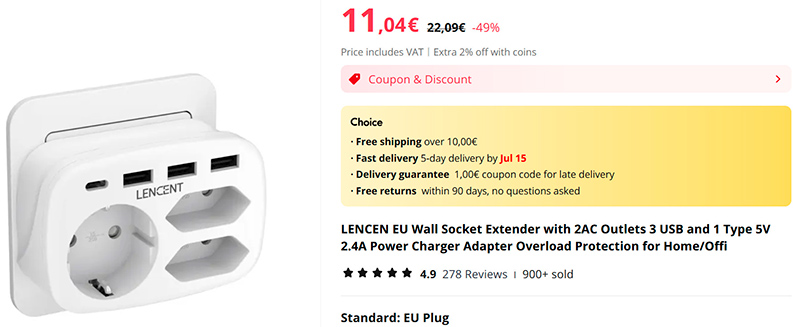 Компактный тройник с тремя розетками, тремя портами USB-A на 12 Вт и портом Type-C на 15 Вт. Там же есть вариант с двумя евророзетками.