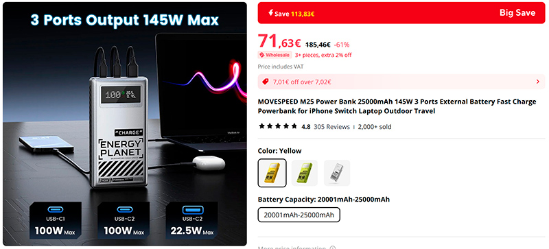 Ну и мне понравился вот такой вариант на 25000 с мощностью 145 ВТ и поддержкой PD 3.0. Три порта - 100 Вт, 100 Вт, 22,5 Вт, - цифровой дисплей, кабель с поддержкой 100 Вт входит в комплект. Удовольствие, конечно, недешевое, но продвинутый аккумулятор, способный заряжать ноутбуки, обычно примерно столько и стоит.