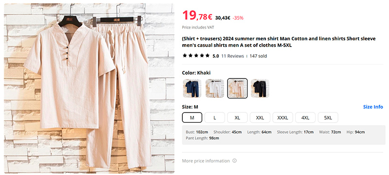 Легкий летний набор из рубашки и брюк свободного покроя на резинке. Три варианта цветов, материал - тонкий хлопок. Размеры азиатские, пишут, что лучше заказывать на пару размеров больше. Есть таблица размеров. Я себе заказал бежевый на пробу. Если понравится, закажу и других цветов.