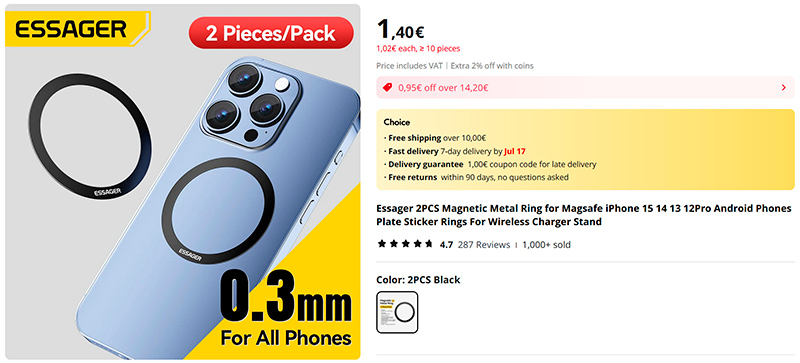Колец этих великое множество (это просто кусок металла определенного размера с липкой лентой), и я себе купил вот эти от Essager. Кстати, под это кольцо есть и автомобильные держатели - как с беспроводной зарядкой, так и без нее.