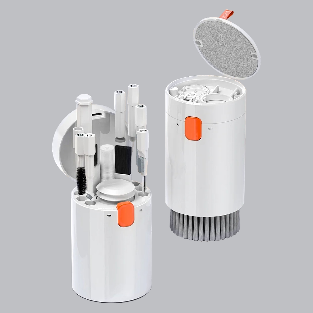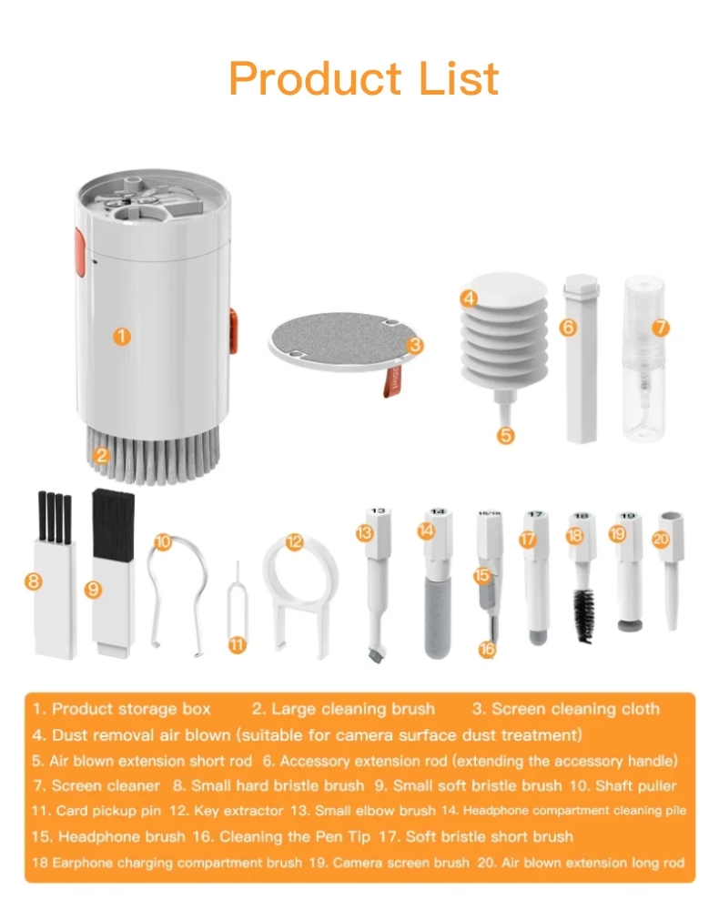 • в наборе 20 инструментов (щётки, губки, груша для выдува, клещи для извлечения клавиш и т. п.)