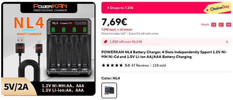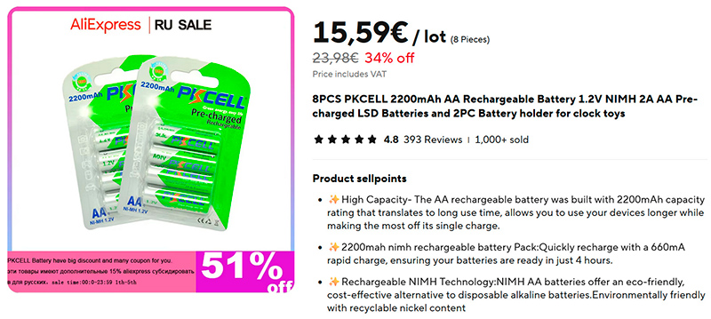 Недорогой набор из восьми никель-металлгидридных перезаряжаемых аккумуляторных батарей (ссылка для РФ) размера АА емкостью 2200 мАч. Приезжают заряженные. Известный и проверенный производитель PKCELL, их фирменный магазин, более 5 тысяч отзывов со средней оценкой 4,8.