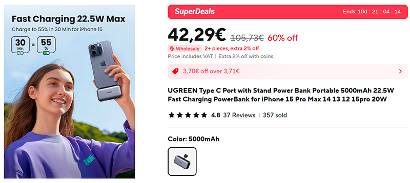 Компания Ugreen выпустила свою модель такого аккумулятора (ссылка для РФ) - на 5000 мАч с мощностью зарядки 22,5 Вт.