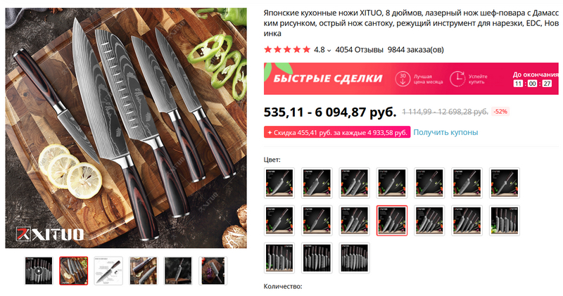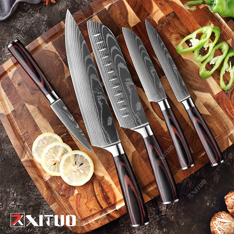 Вот эти кухонные ножи XITUO (типа японские) меня самого страшно заинтересовали. Пишут, что, цитирую: высококачественная нержавеющая сталь, легированная хромом, молибденом и ванадием, с нанесенным на нее с помощью лазерных технологий узором, эргономичная ручка выполнена из натурального дерева.