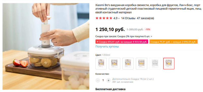 Собственно, почему я об этом вспомнил? У вакууматора, при всей его полезности и нужности, есть альтернатива в виде вакуумных контейнеров, откуда отсасывается воздух. (Мне такой Kitfort как-то присылал, понравилось.) А сейчас появились такие контейнеры от Xiaomi. Это такие пластиковые контейнеры разных размеров с клапаном и с отдельным ручным вакууматором. Там долго сохраняются фрукты и овощи, рекомендуется использовать как ланчбокс для сохранения свежести, также я думаю, что для мяса-рыбы тоже подойдет, хотя там удобнее, конечно, тот вакууматор, о котором я говорю.