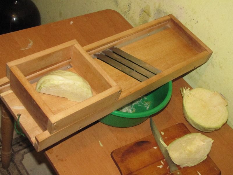 Нашел я простейший, копеечный и вроде бы удобный агрегат для шинковки капусты - ну не умею я ее нормально ножом резать, мне бы приспособление! А хочется самому заквашивать, как мне нужно: без сахара и с соответствующими специями/добавками. В русских магазинах тут капуста с тонной сахара, мне такое не годится. (Задрали они с этим сахаром всегда и везде.)