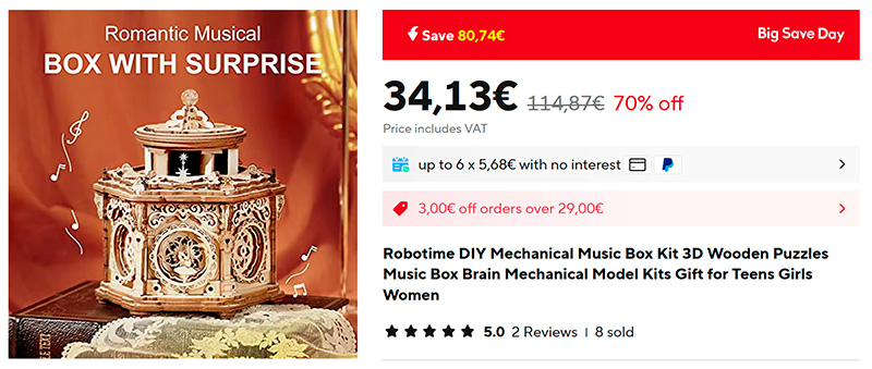 Для любителей деревянных конструкторов - причудливая музыкальная шкатулка (в РФ не поставляют).