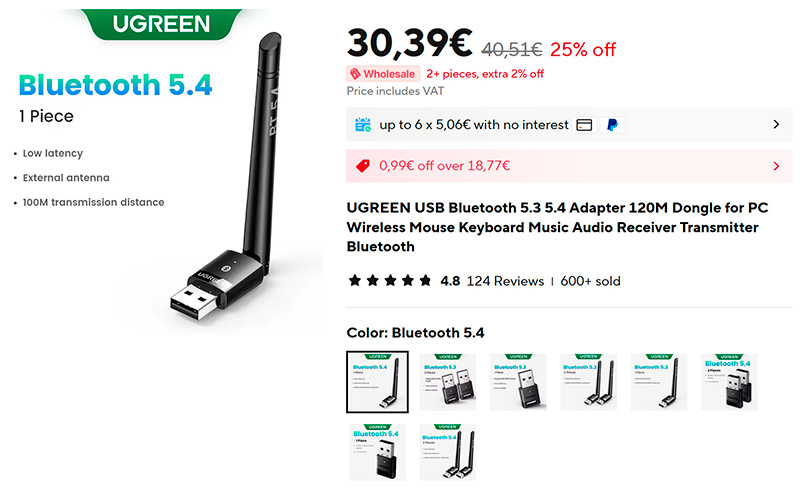 Компания Ugreen выпустила Bluetooth-адаптеры (ссылка для РФ) с поддержкой новейшего Bluetooth 5.3 и 5.4, причем там есть как обычные донглы, так и донглы с внешней антенной, поддерживающие дистанцию аж до 100 метров, как обещает производитель.