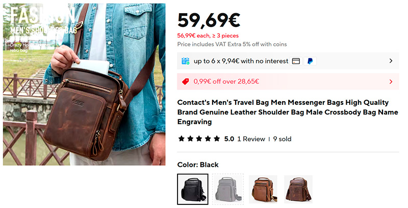 Мужская наплечная сумка из натуральной кожи (ссылка для РФ). Три варианта цветов, есть возможность выгравировать на сумке желаемый текст.
