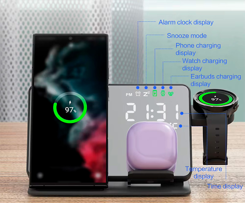 Любопытное беспроводное зарядное устройство "4 в 1" (ссылка для РФ): зарядка любых смартфонов с поддержкой беспроводной зарядки Qi, любых наушников с поддержкой Qi, и умных часов Samsung (только их, потому что у них своя зарядка). Также здесь есть часы с будильником и температурный датчик. Для меня прям идеальный вариант, заказал. Для айфонов и эпловских наушников тоже годится, только для Apple Watch не подойдет. Можно заказать в комплекте с зарядным адаптером.