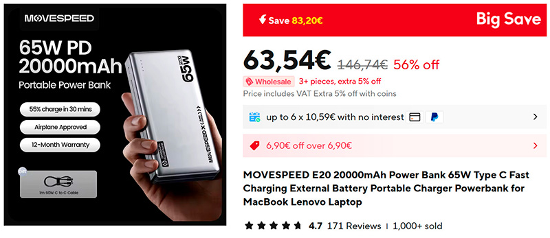Внешний аккумулятор MOVESPEED E20 20000 мАч PD 65 Вт (ссылка для РФ - там он сильно дешевле). Годится для зарядки любых ноутбуков, его можно брать в салон самолета, размеры 14x6.8x2.8 см, масса 402 г. 2 порта USB-A + Type-C. В комплекте кабель Type-C.