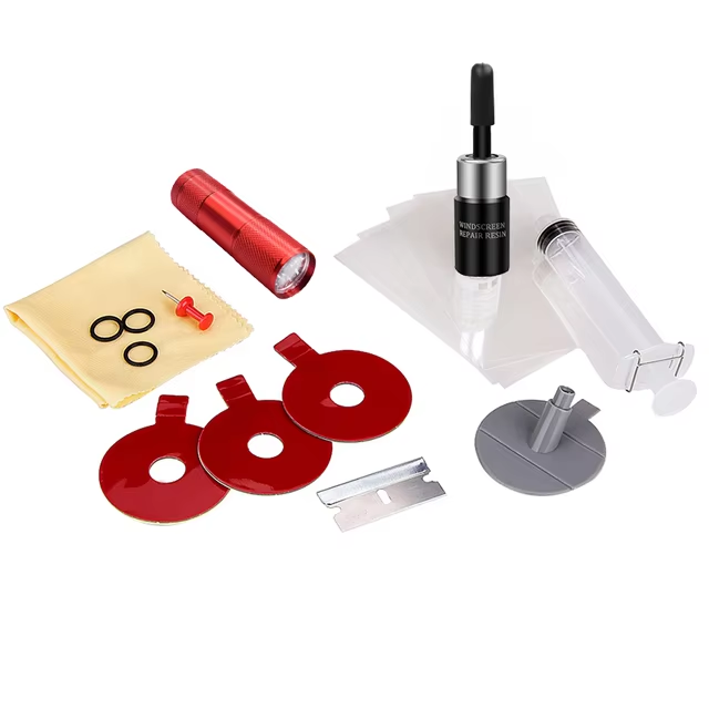 Поможет восстановить лобовое стекло после небольших сколов. Заливаете его в трещину, создаёте давление шприцем и даёте затянуться, затем наклеиваете специальную плёнку. После этого счищаете клей и любуетесь результатом. УФ фонарик для скорейшего затвердения клея.