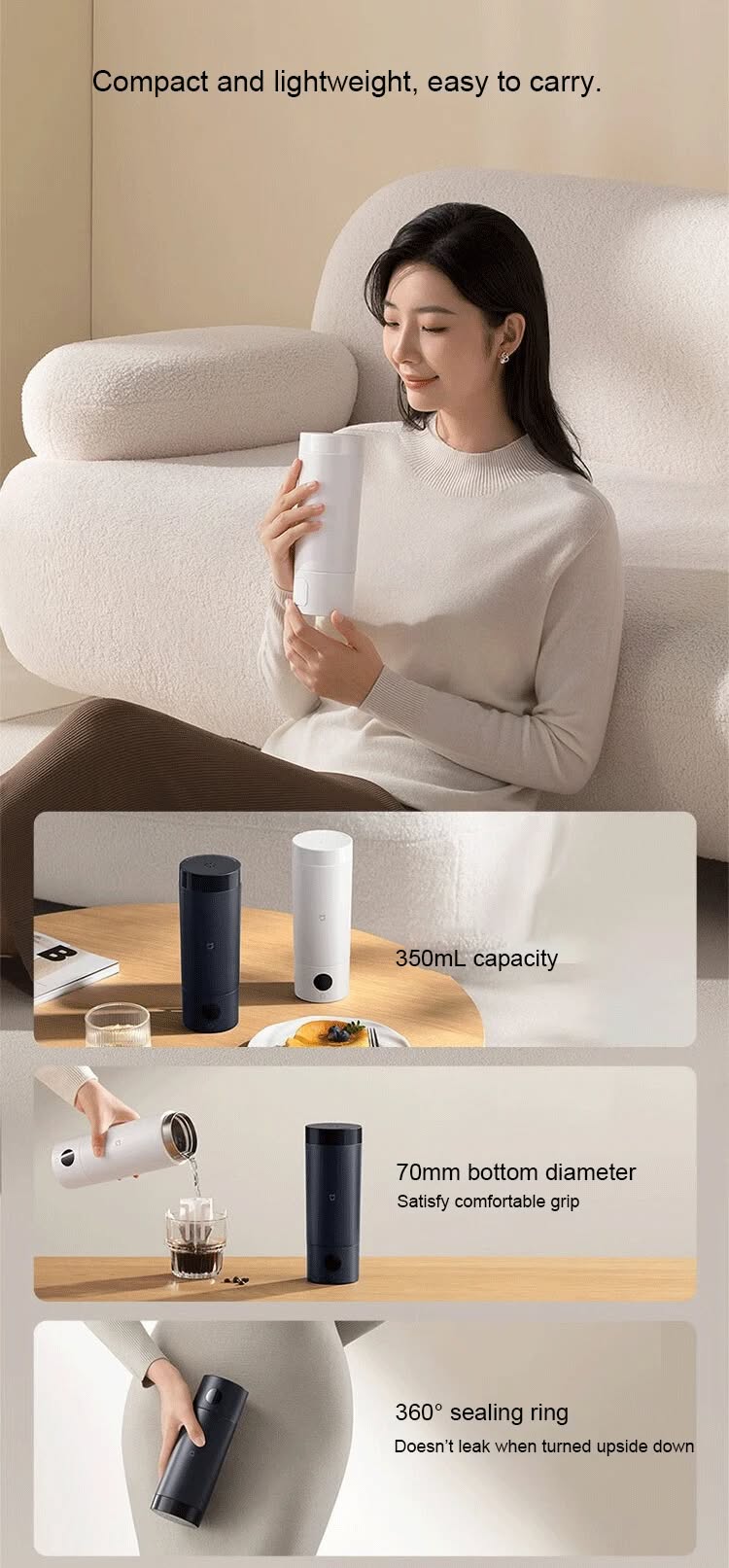 Работает от сети. 6 режимов температур от 45 до 99 градусов. Автоматическое отключение. Поддерживает постоянную температуру до 12 часов в режиме термостата от сети и до 6 часов держит температуру автономно, как термос. Емкость 350мл. Закипает за 5 мин. Есть LED экран, показывающий текущую температуру.