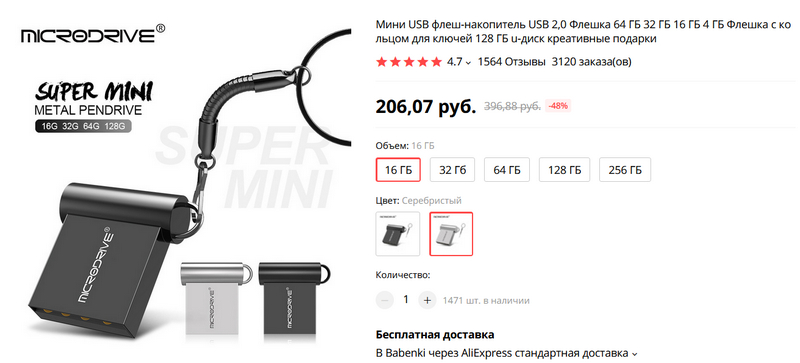 Здесь можно выбрать цвет (черный, серебристый) и емкость - от 16 до 256 ГБ.