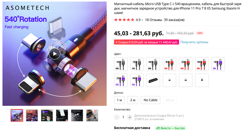 И вот как раз нашел новый, более удобный тип таких кабелей - у них головка вращается на 540 градусов (ну, в смысле, до 360 градусов по одной оси и до 180 по другой). Есть все виды головок (microUSB, Type-C, айфонный Lightning), присутствуют разные цвета и разные размеры. Отдельно головки тоже можно докупить. Так что я себе взял два комплекта - для стола и для машины.