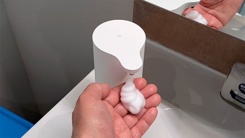 Жужжит мелодично. Датчик руки срабатывает четко, ложных срабатываний не бывает. (У меня один диспенсер в какой-то момент сошел с ума и начал выбрасывать пену так, как будто хотел заполонить этой пеной весь мир. Видимо, датчик у него засорился. Я выключил, промыл - тот снова заработал нормально.)
