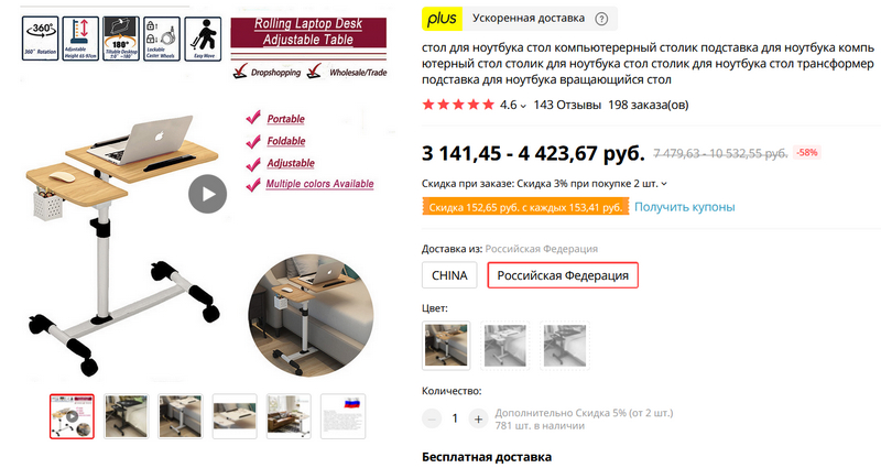 Для любителей сидеть с ноутбуком в постели - удобный столик-подставка. Есть доставка с российского склада. Если заказывать из Китая, то есть три варианта цветов (из России - только под дерево, но он, на мой взгляд, самое что надо).