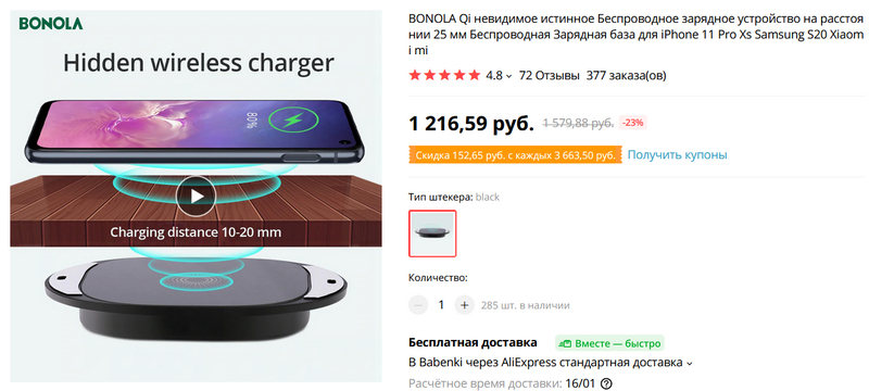 Вот это очень интересная штука - скрытая беспроводная зарядка. То есть приклеиваете ее к нижней крышке стола или тумбочки (там лента 3M), и дальше остается телефон просто положить на соответствующее место стола или тумбочки, чтобы он стал заряжаться. Толщина крышки может быть от 3 до 25 мм. Максимальная мощность зарядки - 10 ватт.