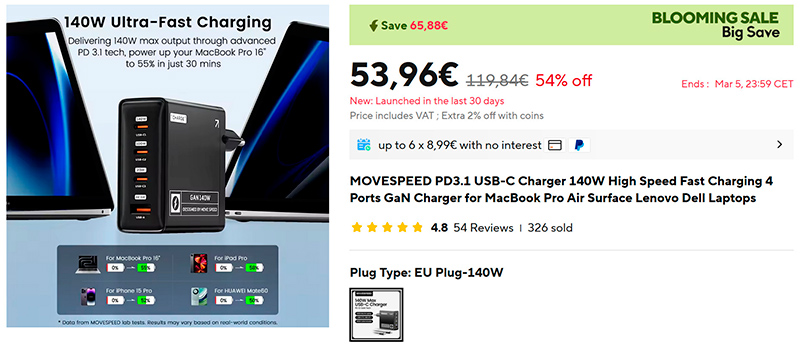 Адаптер UGREEN на 140 Вт прям очень негуманно стоит - аж €160. А вот у Movespeed GaN-адаптер на 140 Вт - стоит €54 (ссылка для РФ).