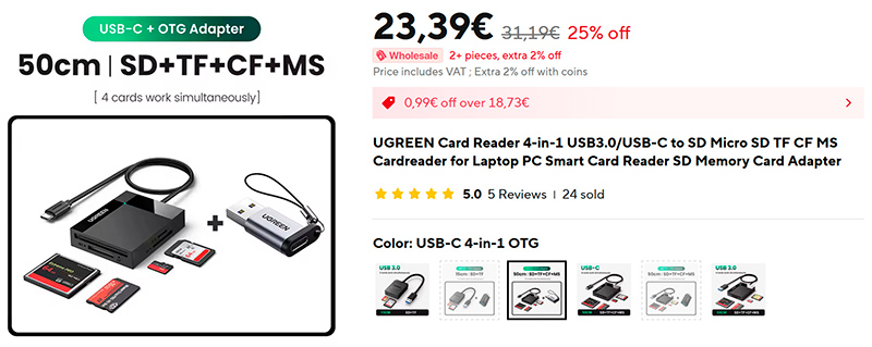 Вообще такие кардридеры - устройства простые, но я сталкивался с тем, что всякие Unknown кардридеры далеко не всегда нормально подключаются. Потом в итоге купил вот такой кардридер от Ugreen (ссылка для РФ) - и теперь горя не знаю, работает железно, при этом поддерживает все четыре типа карт памяти (мало ли что), подключается по Type-C и через USB-A через входящий в комплект переходник.