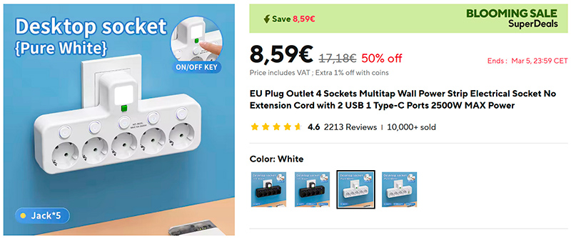 Иногда в хозяйстве требуется не тройник, а четверник или даже пятерник. На Aliexpress есть такой вариант - пятерник, включающийся в розетку. У каждой розетки есть свой выключатель, можно включить легкую подсветку. Есть вариант, где вместо пятой розетки - три порта USB. Черная и белая расцветки.