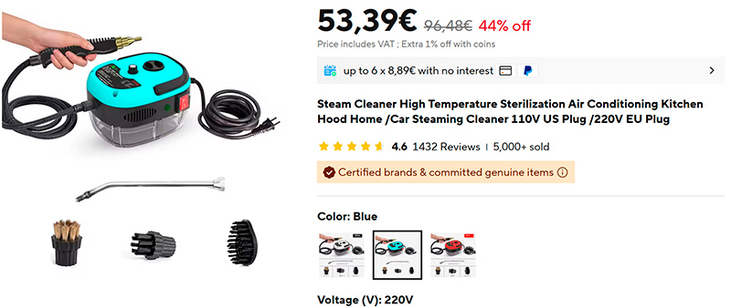 Очень полезная в хозяйстве штука - пароочиститель (ссылка для РФ). Легко и быстро очищает самые серьезные загрязнения плитки, различных покрытий, сантехники, плиты, посуды, окон и так далее. При этом так как речь идет о паре, находящемся под большим давлением, очищаемая поверхность еще и дезинфицируется. В комплекте идет четыре вида насадок для различных применений. Три варианта цветов.