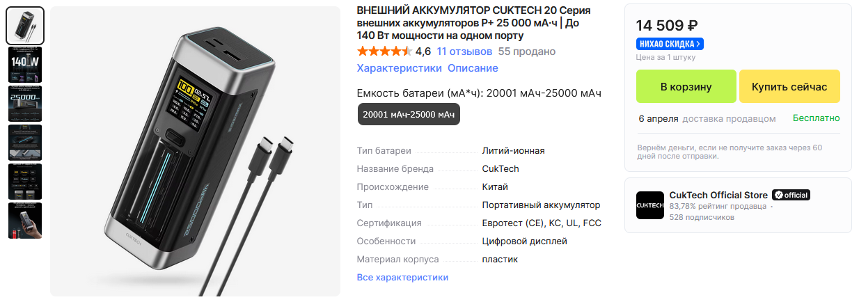 - До 140 Вт мощности на одном порту. Впечатляет, спокойно потянет ноут.