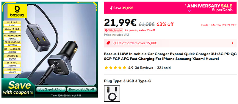 Если вы в машине периодически ездите не один, а вдвоем-втроем-вчетвером, то имеет смысл приобрести вот такое продвинутое зарядное устройство от Baseus (ссылка для РФ): это мощный адаптер для зарядки на два порта мощностью аж в 110 Вт, также к нему идет подключаемый удлинитель еще на четыре порта - два USB-A и два Type-C. Классная штука, заказал себе. Было несколько случаев, когда такой адаптер с удлинителем очень бы выручил. Я писал об адаптере с постоянно подключенным удлинителем, а здесь удлинитель можно отключать, так что адаптер получается универсальный.