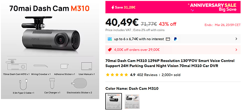 Сейчас на рынке присутствует новая, более продвинутая модель 70mai Dash Cam M310 (ссылка для РФ). Такая же компактная и недорогая, при этом разрешение - 2304x1296 пикселей. Управляется через мобильное приложение и голосовые команды, есть кнопка сохранения записи определенного момента, есть вариант комплектации с parking kit - чтобы еще круглосуточно следить и записывать на парковке.