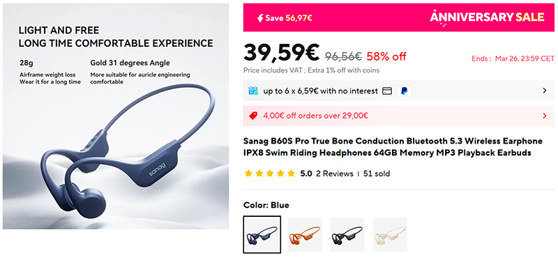 У этого производителя вышла новая, более продвинутая модель наушников костной проводимости Sanag B60S Pro (ссылка для РФ). Они влагозащищенные, снабжены защитой IPX8, могут использоваться как обычные наушники костной проводимости со смартфоном, также они имеют встроенную память 64 ГБ и могут воспроизводить аудиотреки, загруженные туда, без подключения к смартфону: то есть их также можно использовать и во время плавания.