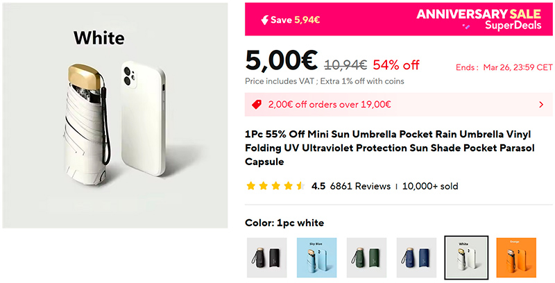 Суперкомпактные складные зонты (ссылка для РФ), пользующиеся большой популярностью. В сложенном виде они становятся плоскими, по размеру - не больше смартфона. Легко помещаются в любую сумку и даже в карман. 8 вариантов цветов.