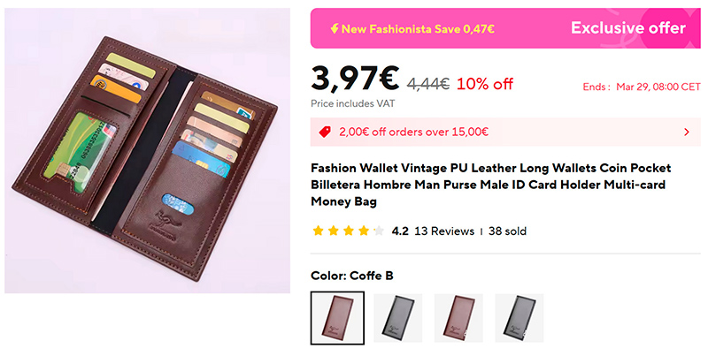 Полноразмерный (купюры помещаются без складывания) кошелек из искусственной кожи (ссылка для РФ) с прозрачным отделением для ID, кучей отделений для пластиковых карт и двумя отделениями для купюр. Два цвета, два варианта оформления. Продавец утверждает, что в таком кошельке купюры имеют обыкновение размножаться.