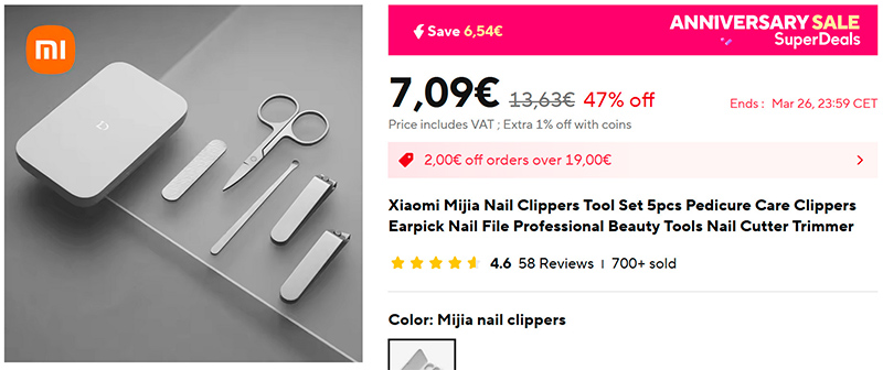 Набор для ухода за ногтями Xiaomi Mijia (ссылка для РФ). Мне для поездок такой нужен, заказал. А то я как-то заказывал аналогичный набор в Германии - "настоящее немецкое качество", - так там ножницы стали ржаветь через неделю после начала использования. Посмотрим, как с этим делом у Xiaomi. Что-то мне подсказывает, что должно быть получше. Я уже с этим "настоящим немецким качеством" несколько раз здорово прокалывался.