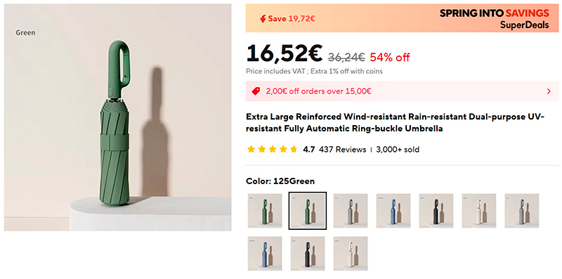 Большой (125 см в диаметре) автоматический складной зонт (ссылка для РФ) с усиленной защитой от ветра и дождя с ручкой, позволяющей крепить его при необходимости, например, к рюкзаку. Под таким зонтом спокойно могут укрываться два человека.